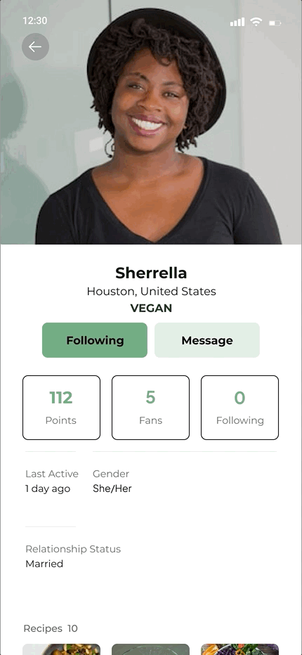 Test participants expressed interest in viewing recipes and reviews from users they follow. To address this, the Community feature was updated to prominently display a section for recipes and reviews on a member’s profile page. Color adjustments were also made to adhere to accessibility standards.