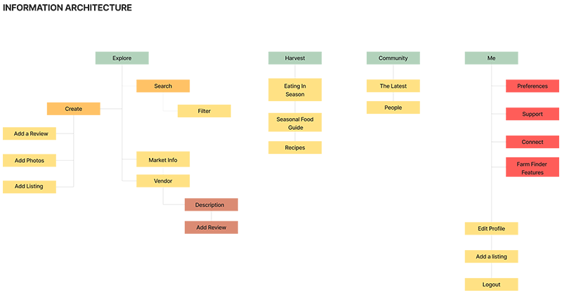Based on feedback requesting more color variation, the "Sort" button was updated to gray, while the last three buttons were given a darker green background with white text. This not only added visual distinction but also adhered to accessibility standards. I also increased the font size of the farmers market names and their availability.
